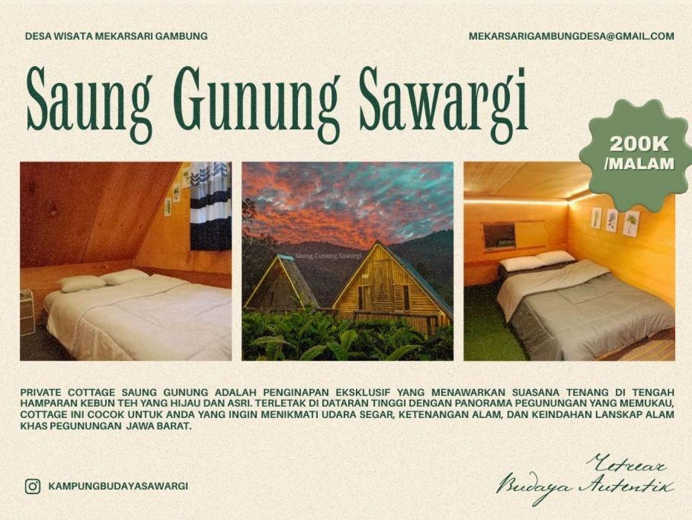 Kamar di Kampung Saung Gunung Sawargi dirancang dengan nuansa tradisional yang hangat, memadukan kenyamanan modern dan ketenangan alam pegunungan. Setiap kamar memiliki interior bernuansa kayu yang memberikan suasana alami dan menenangkan. Dari jendela kamar, tamu dapat menikmati pemandangan hijau yang luas, mulai dari kebun teh hingga lansekap pegunungan yang segar.