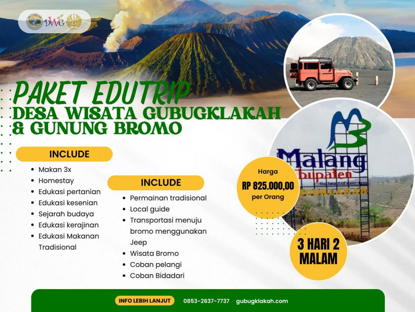 Paket Edutrip Desa Wisata Gubugklakah & Gunung Bromo menawarkan pengalaman wisata yang lengkap dan bermakna bagi peserta yang ingin belajar sekaligus berpetualang. Selama 3 hari 2 malam, wisatawan akan mengikuti berbagai kegiatan edukatif seperti pembelajaran pertanian, kesenian, kerajinan, dan pembuatan makanan tradisional. Selain itu, peserta dapat menikmati permainan tradisional khas desa serta menjelajahi keindahan alam Gunung Bromo menggunakan Jeep. Perjalanan juga dilengkapi kunjungan ke destinasi alam menawan seperti Coban Pelangi dan Coban Bidadari. Paket ini sudah termasuk makan 3 kali sehari, homestay nyaman, local guide profesional, serta transportasi menuju Bromo. Dengan harga Rp 825.000 per orang, program ini sangat cocok untuk pelajar, mahasiswa, dan komunitas yang ingin menikmati wisata edukatif bernuansa budaya dan alam.
